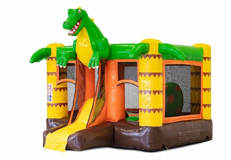 Opblaasbaar springkussen met glijbaan in dino thema in het groen met geel bestellen voor kinderen