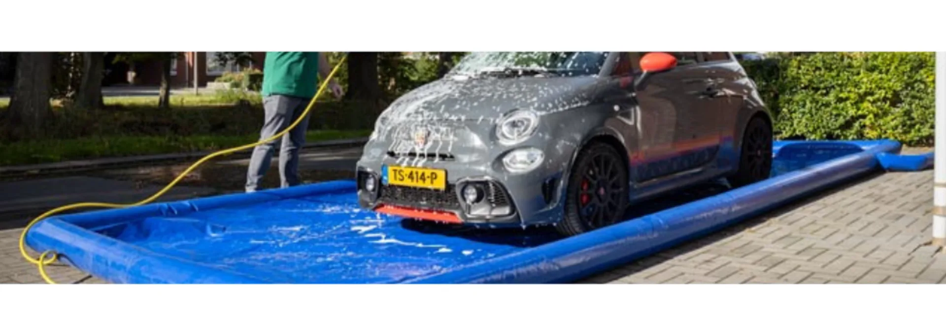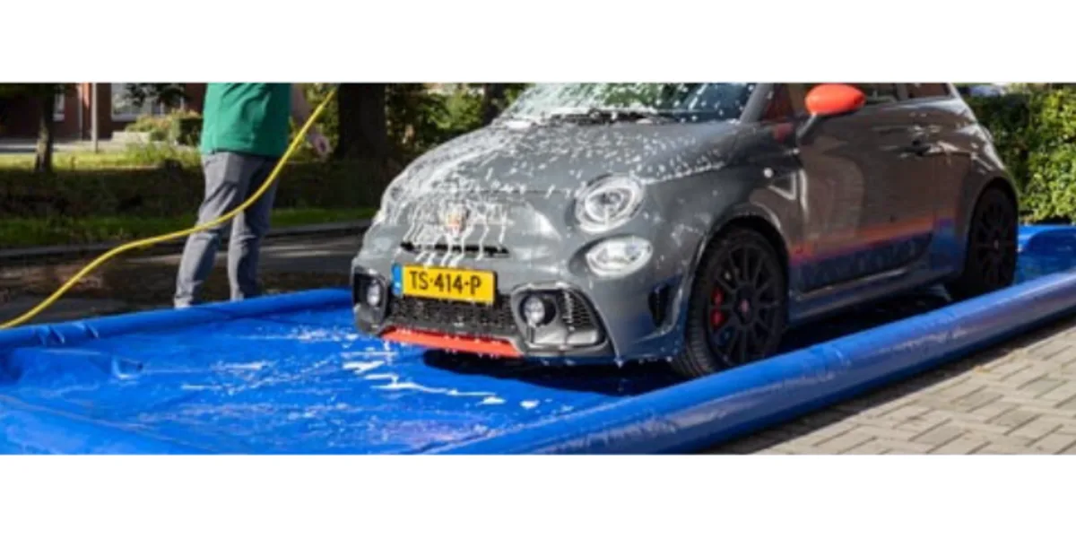 Man maakt Abarth auto schoon op inflatable auto badje